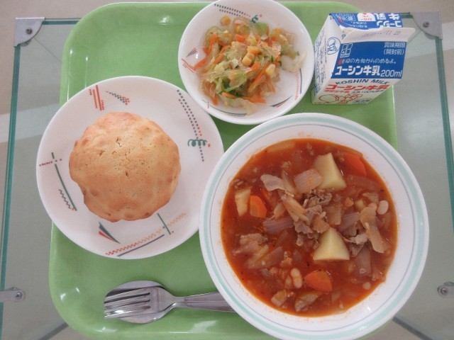ビスキュイパン・ポークビーンズ・糸寒天入りサラダ・牛乳