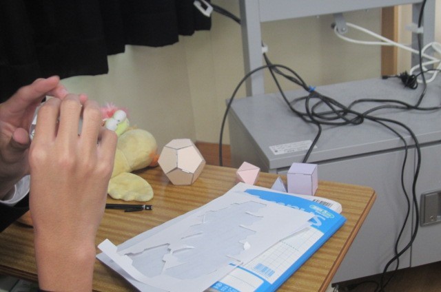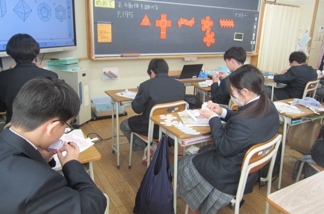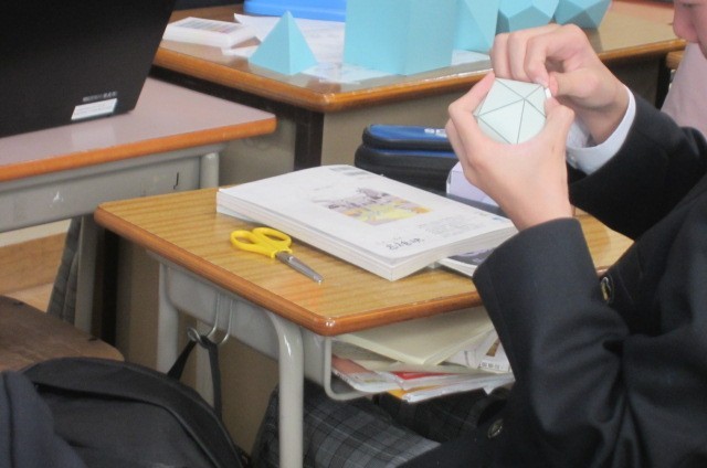 7年生の数学は空間図形について学習しています。教室で学習しているグループは、正多面体を扱っていました。教科書の後ろには5種類の正多面体の展開図がついていて、実際に組み立てることができます。生徒たちは展開図を切り取り、5種類の正多面体を苦労しながら組み立てていました。出来上がった立体を手に取りながら、頂点の数や辺の数などを調べ、表にまとめていきました。同じ数字が出てきて不思議さを感じることができました。