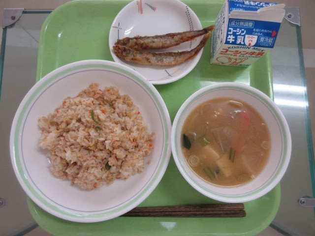 高野豆腐のそぼろご飯・ししゃもの香味揚げ・さつま汁・牛乳