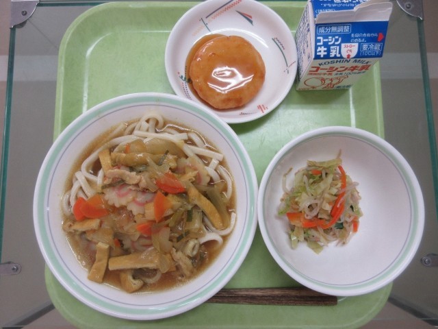 かけカレーうどん・野菜の甘酢和え・いももち・牛乳