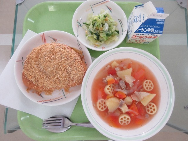 焼きカレーパン・トマトとマカロニのスープ・昆布茶サラダ・牛乳