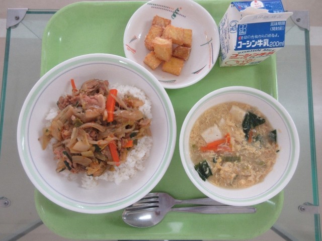 豚キムチ丼・卵スープ・キャラメルポテト・牛乳