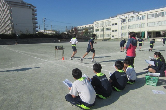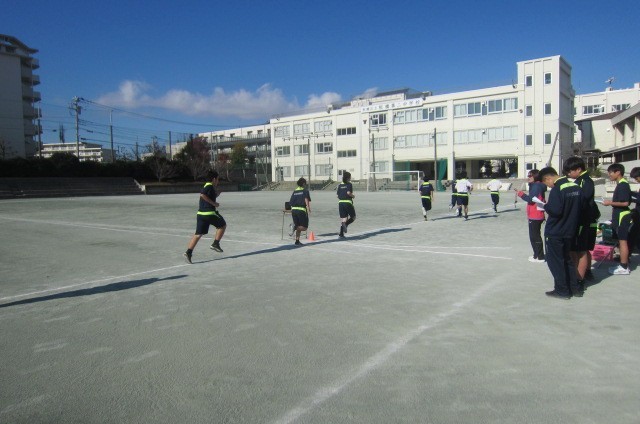 8年生長距離走 公開日 2025/12/17 更新日 2025/12/17 できごと 12月17日(水) 8年生の体育の授業では長距離走に取り組んでいます。12分間で2500~3000mを走れるように、ペースのアップダウンをなくして効率的に走ることを目標に取り組んでいます。2人一組で1周ごとの時間を学習カードに記録し、前回との比較ができるようにしています。友達同士で声をかけあって競い合い、楽しそうに取り組んでいました。