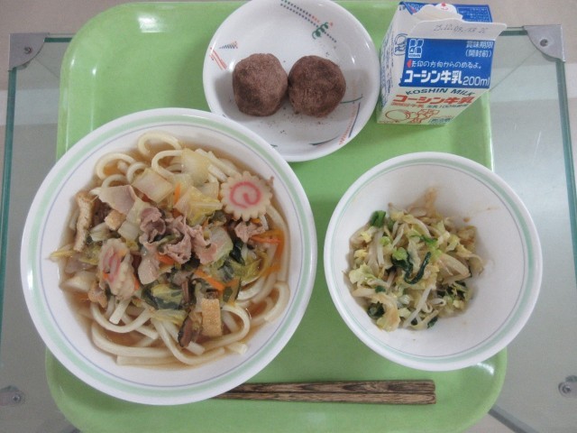 かけ五目うどん・ごま和え・くろすけボール・牛乳