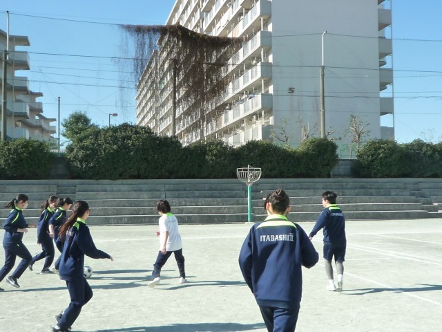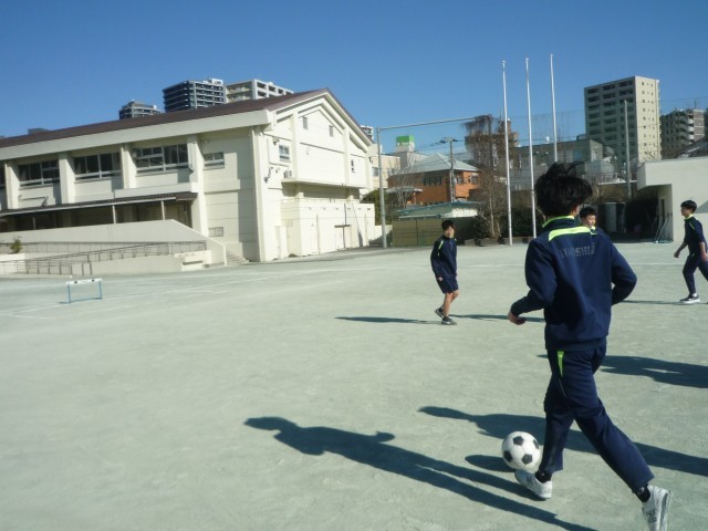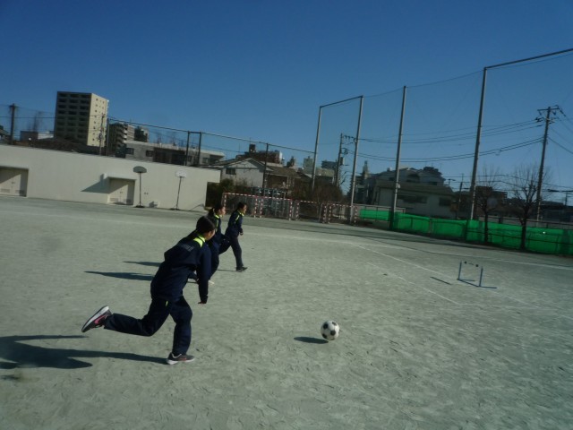 2校時の9年B組の様子です。体育の授業でサッカーに取り組んでいました。ウォーミングアップでは5周走ってから、パス交換を2人から3人組で行い、体を十分にほぐしてからミニゲームを行いました。ハードルをゴールとして3対3や4対4のゲームを楽しみました。ボールをしっかり見る、止める、蹴るの基礎的な動きと密集しがちだったので広がってスペースを使うよう先生からコーチングを受けてゲームの質を高めることができていました。