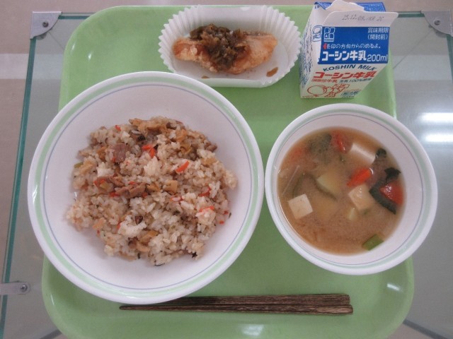 中華おこわ・白身魚の板橋長葱ソースかけ・さつま汁・牛乳