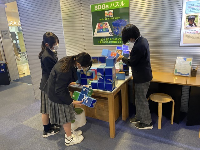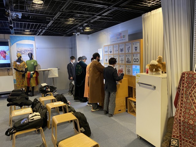 C組は午前中、A,B組は午後がJICAの見学です。JICA 地球ひろばでは、世界の国々の課題の展示を見学し、海外協力隊で開発途上国に出かけた方からお話を聞きました。