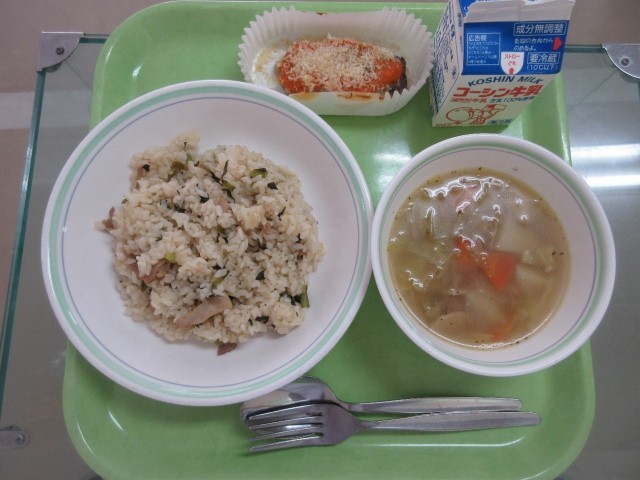 ハムと小松菜のピラフ・白身魚のパン粉焼き・ベーコンと野菜のスープ・牛乳
