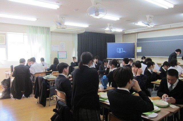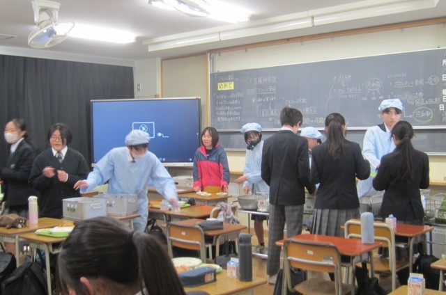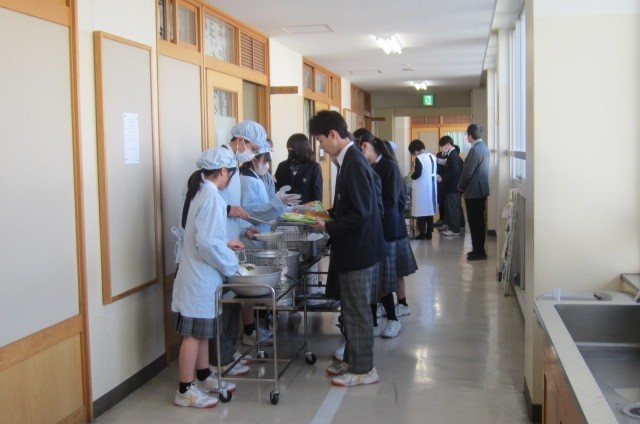 給食の時間 公開日 2026/01/29 更新日 2026/01/29 できごと 1月29日(木) 4校時が終わると給食の時間です。各クラスでは給食当番が配膳を行っています。担任や副担任の先生もお手伝いしてくれています。さすがに9年生は食べ始めが早いです。今日はクリームシチューとホットドックのメニューです。
