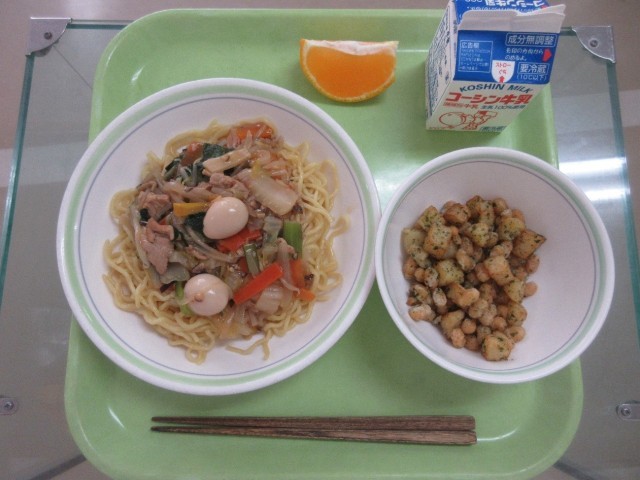 あんかけ焼きそば・青のりポテトビーンズ・果物(でこぽん)・牛乳