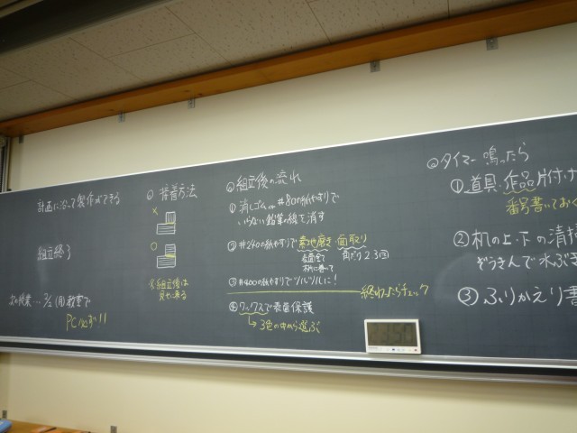7年生の技術では木工作品の製作に取り組んでいます。3時間目の7年A組の授業では組立後の流れについて確認し、仕上げの作業を行っていました。内容は次のとおりです。 ①消しゴムもしくは#80の紙やすりでいらない鉛筆の線を消す ②#240の紙やすりで素地磨きを行い面取りをする ③#400の紙やすりでつるつるにする ④3色の中から選びワックスで表面を保護する