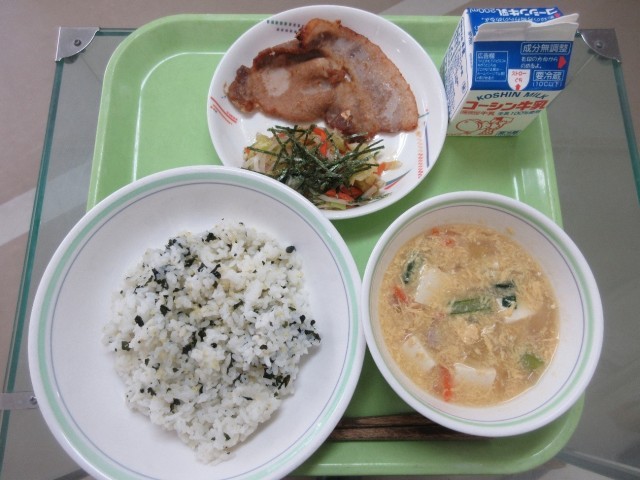 きびわかご飯・豚肉の生姜焼き・磯香和え・卵スープ・牛乳