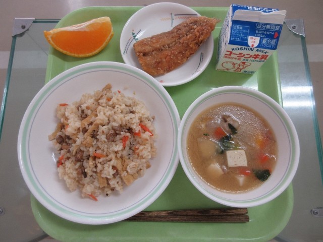 節分ご飯・いわしの唐揚げ・豆腐と里芋の味噌汁・果物(でこぽん)・牛乳