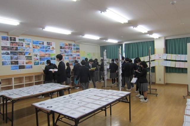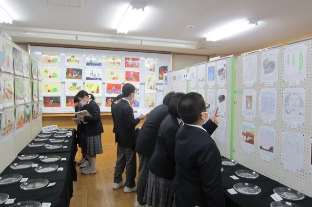 作品展生徒鑑賞 公開日 2026/02/12 更新日 2026/02/12 できごと 2月12日(木) 今日から校内作品展が始まりました。各学年1時間ずつ生徒鑑賞の時間を設け、3つの会場を回っています。鑑賞カードをもって、よくできている作品や印象に残った作品をメモしています。7、8年生は次の学年ではこんな作品を製作するんだということを知って、翌年の活動を楽しみにしています。