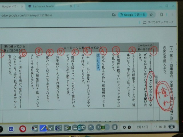 2月16日(月) 7年生の国語では「少年の日の思い出」という教材の主人公「僕」の心情の読み取りに取り組んでいました。友達の標本を破損させてしまった主人公の思いをまず個人で言語化して整理して全体で発表し共有することで生徒たちは自分の考えを深めていました。この時間はティームティーチングを行っており、個人で考えを深める時間の際に2人の国語科教員が声かけを行いながら生徒自身が様々な考えを自分で選択できるように支援していました。