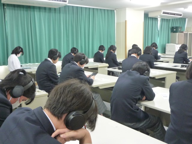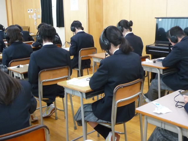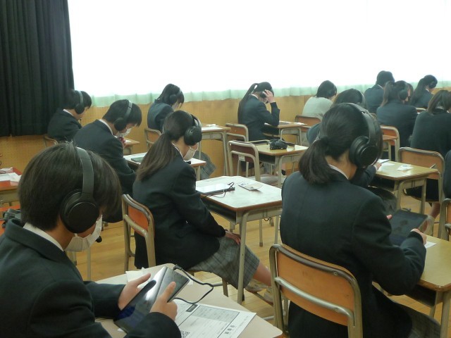 11月に外部の会場で行われましたが、7,8年生は各学校に運営者が来校して行われます。専用タブレットの指示に従ってヘッドセットをつけ、問題に合わせて各自が発音していました。英語の授業を通じて、話す力がどれだけついているか確かめます。