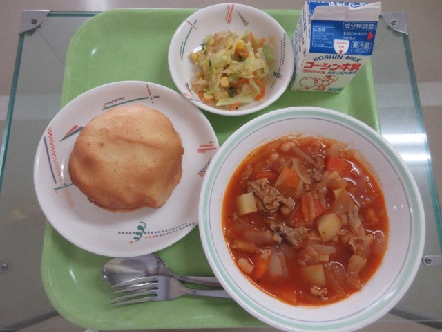 ビスキュイパン・ポークビーンズ・糸寒天入りサラダ・牛乳