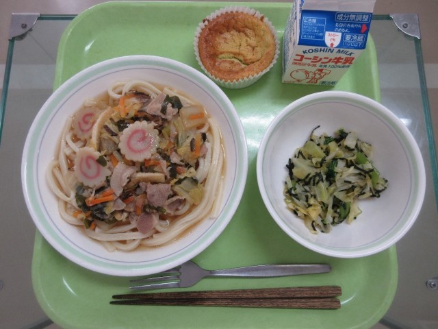かけ五目うどん・キャベツの磯和え・明日葉チーズケーキ・牛乳