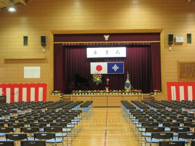 朝方の雨も上がり、卒業式の朝を迎えました。会場の準備は整っています。式は10時開式です。9年生のみなさん、中学校生活の集大成として、これまでの成長の証を保護者、地域の方に披露してください。