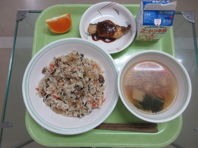 ひじきご飯・魚のにんにく味噌焼き・けんちん汁・果物(せとか)・牛乳