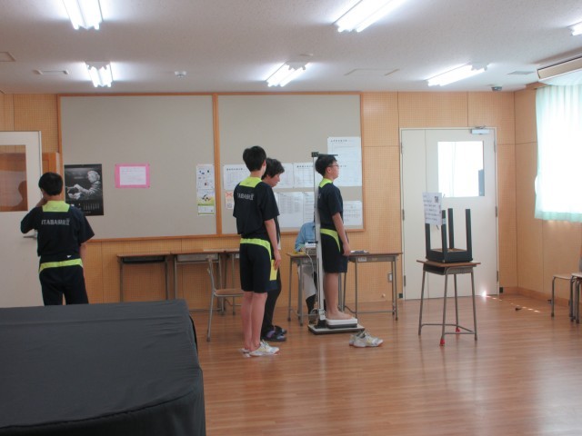 全校で身体計測を行いました。身長、体重、視力、聴力の測定と検査をしています。授業と並行して行っているため、測定員には学校支援地域本部のコーディネーターの方にもお手伝いいただきました。