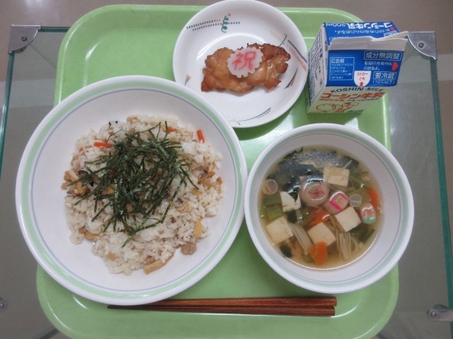 五目ちらし寿司・鶏の照り焼き・手まり麩入りすまし汁・牛乳
