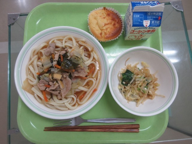 かけ五目うどん・ごま和え・りんごとヨーグルトのケーキ・牛乳