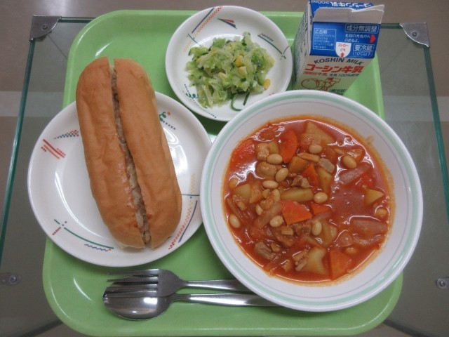 ツナドック・鶏肉と大豆のトマト煮・春キャベツのサラダ・牛乳