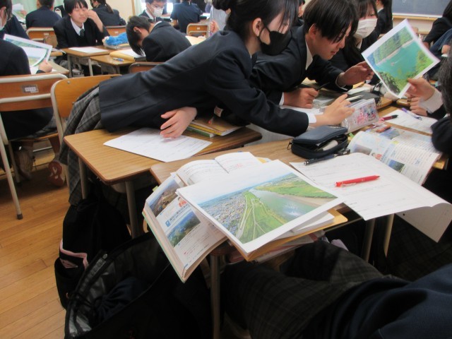 8年生の社会では地理で、日本の川の特徴を学習していました。5つの川の写真について班で日本の川なのか、外国の川なのかを予想し、その結果から日本の川の特徴、地形について確認していました。「どちらなんだろう」と考えることで考えが深まり、答えが分かったときに知識が定着していきます。