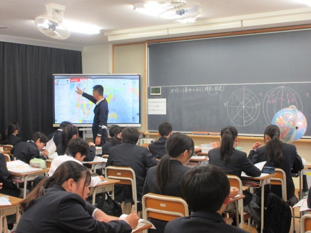 7年生でも社会の地理を学習していました。7年生のはじめは世界地図での緯度、経度の学習です。イギリスのところの基準から西側、東側にどれだけ離れているかを東経、西経で表すことを地球儀や画面の地図を使って、ゆっくり思考する時間も取りながら授業が進められていました。