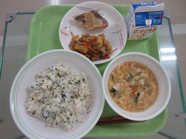 きびわかご飯・魚のごま味噌焼き・じゃがいものきんぴら炒め・かきたま汁・牛乳