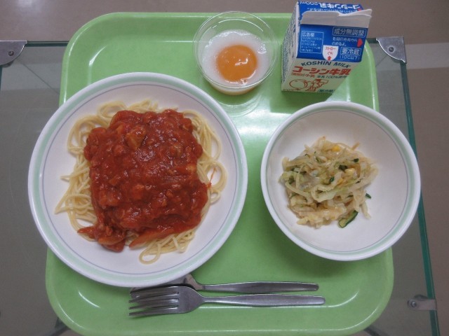ツナのトマトソースパスタ・コールスローサラダ・おかしな目玉焼き・牛乳