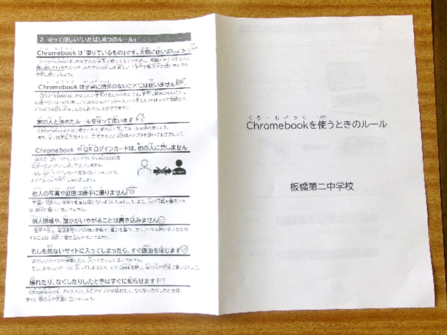 端末とあわせて、板橋区共通の「いたばし 8つのルール」および学校独自の利用ルールについてのプリントを配付しています。ICT端末は非常に便利な道具ですが、正しく使うための「自律」が求められます。ご家庭におかれましても、ぜひお子様と一緒にプリントをご一読いただき、「我が家のルール」や「安全な使い道」についてお話しいただくきっかけにしていただければ幸いです。これから授業や家庭学習で、この端末を最大限に活用し、学びを深めていきたいと思います。