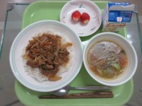 【本日の献立】プルコギ丼・ビーフンスープ・果物(いちご)・牛乳