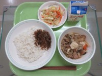 【本日の献立】ご飯・骨太ふりかけ・すき焼き風肉豆腐・海鮮サラダ・牛乳