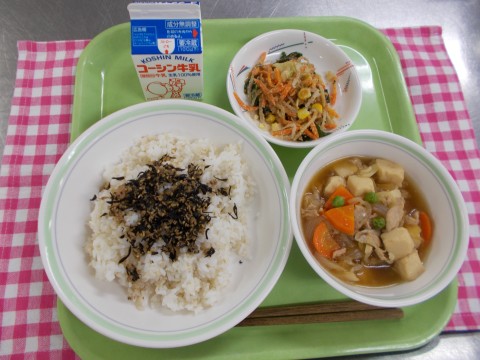 麦ご飯、ツナとひじきのふりかけ、肉豆腐、野菜のねりごま和え、牛乳