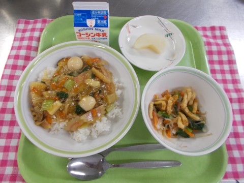 中華丼、カリカリ油揚げのサラダ、果物(梨)、牛乳