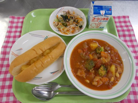 手作りりんごジャムサンド、ハンガリーシチュー、ツナと海藻のサラダ、牛乳