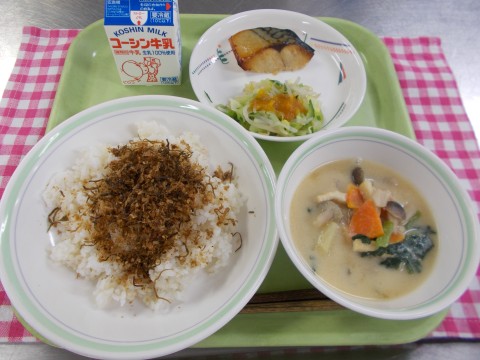 麦ご飯&おかかふりかけ、鯖の塩麹焼き、人参ソース和え、とれたてしめじのみそ汁、牛乳