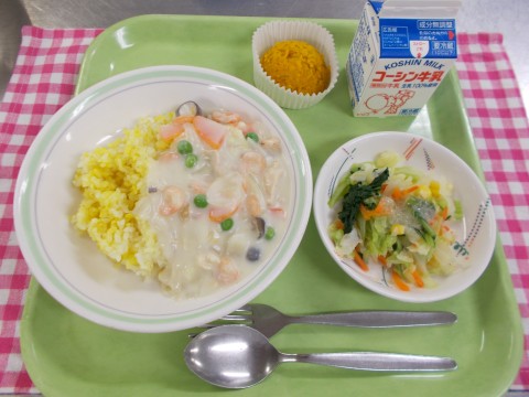 えびクリームライス、コーンサラダ、スイートパンプキン、牛乳