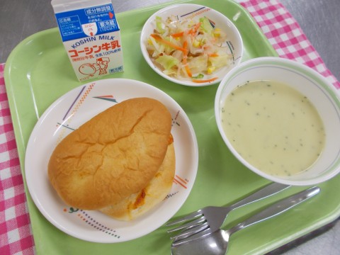 ホットピザサンド、アーモンドサラダ、さつまいものポタージュ、牛乳