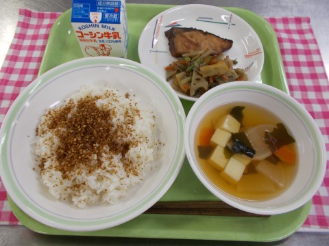 かつおでんぶご飯、鰤のみそ漬け焼き、きんぴらごぼう、わかめのすまし汁、牛乳