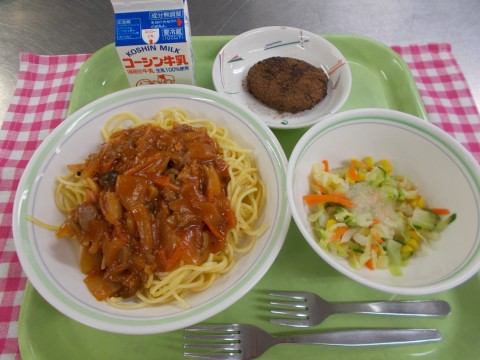 きのこのトマトスパゲッティ、キャベツのサラダ、ココアもち、牛乳、牛乳