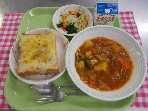チキングラタンパン、トマトシチュー、キャベツとコーンのサラダ、牛乳
