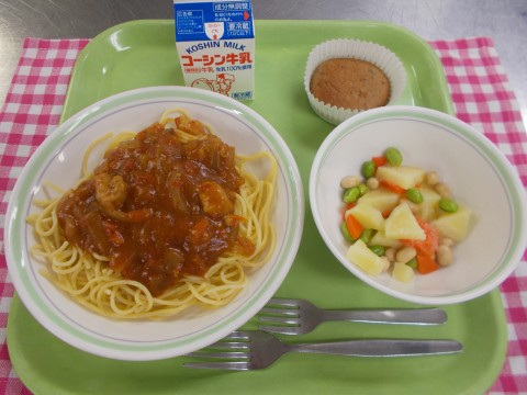 スパゲッティオリエンタル、豆まめサラダ、バナナとアーモンドのケーキ、牛乳