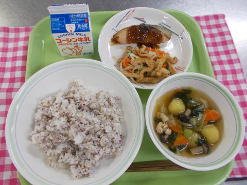 梅ちりめんご飯、鰹のねぎだれ焼き、千草和え、せんだご汁、牛乳