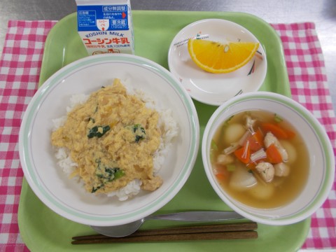 親子丼、七草雑煮、果物(スイートスプリング)、牛乳