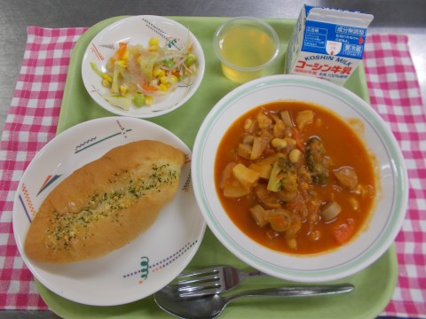 ガーリックフランス、ウインナーのトマト煮、キャベツサラダ、アップルゼリー、牛乳