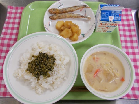 麦ご飯&小松菜のふりかけ、ししゃものカレー揚げ、じゃが芋の煮物、鶏肉と大根のみそ汁、牛乳