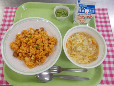 ウインナーのケチャップライス、玉子と野菜のスープ、小松菜ケーキ、牛乳